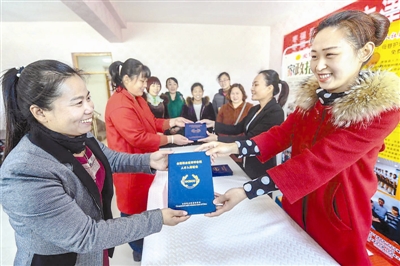 4月6日,培训机构工作人员(右)为学员颁发家政信用评价证书。