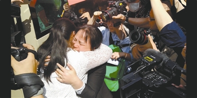 康英(左一)走下车的一刹那,刘登英一把抱住女儿,任泪水决堤。