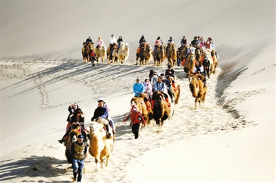 4月5日,游客在甘肃省敦煌市鸣沙山月牙泉景区参观游览。