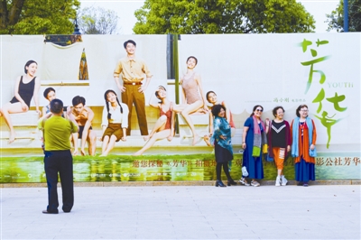 近日,海南省观澜湖华谊冯小刚电影公社入口处,一群游客在电影《芳华》的海报前合影。该电影公社位于海口,以多部冯氏电影场景为建筑规划元素,进而打造综合文创商业街区,目前已成为海口市一处重要的文旅景点,吸引着喜爱电影的游客前来参观。