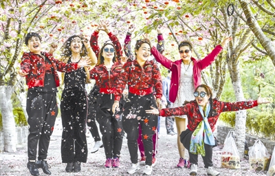 在陕西省汉中市宁强县青木川镇樱花巷,来自甘肃省天水市的游客拾起地下的樱花瓣抛向天空(4月5日摄)。截至3月底,青木川景区累计接待24.98万人,旅游综合收入11006万元。