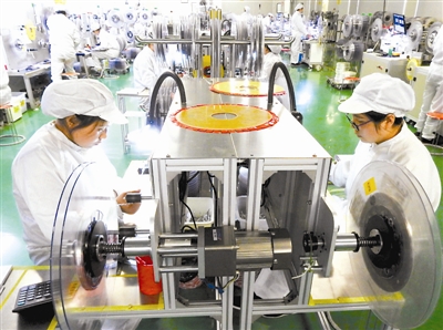 4月9日,工人在连云港经济技术开发区一家电子科技公司的锂电池极耳生产线上忙碌。
