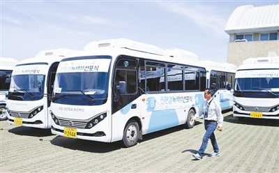 当日,20辆比亚迪eBus-7型纯电动巴士在韩国济州岛的牛岛景区交付运营,成为牛岛的环岛旅游巴士。 新华社记者 王婧嫱 摄
