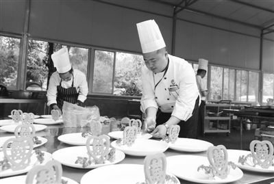 4月9日,成都,温贤根和团队成员正在用盐做的“喜”字摆盘。上午10点半,40桌喜宴的所有菜肴基本准备完毕。准备这场40桌的农村坝坝宴,温贤根团队煮完不过耗时5个小时。