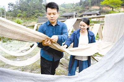 4月12日,吴方俊(左)、杨成兰夫妇在查看刚染的侗族土布。