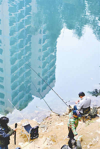 ④几位“候鸟人”在盘阳河上垂钓,对面高楼倒映在河面上。视觉中国 供图