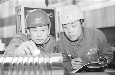 4月3日,河钢宣钢“刘大庆创新工作室”带头人刘大庆(左)正在检查轧辊加工质量。今年1月到3月,该创新工作室累计开展技术攻关20余项,实现创效30万元。