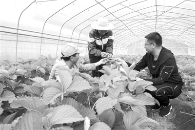 4月10日,贵州省毕节市大方县凤山乡店子社区,返乡就业的金兴业(中)与两位村民在果蔬棚查看草莓的生长情况。