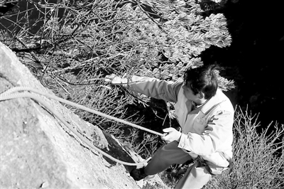 安徽黄山:放绳工绝壁下为游客拾手机