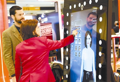 4月17日,在西班牙马德里,一名阿里巴巴的西班牙志愿者(左)在世界零售大会上为客商讲解天猫虚拟穿衣体验技术“魔镜”。