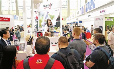 在广交会进口展区,来自韩国的企业在推销一款果汁机(4月15日摄)。