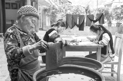 4月11日,贵州省织金县官寨苗族乡,三名蜡染手工艺人在分别进行染制和绘制工作。苗族蜡染是当地少数民族最普遍的工艺美术,当地居民通过老传少、母传女或相互学习将蜡染技艺一代一代地传承下来。其于2015年1月入选贵州省人民政府非物质文化遗产传统技艺类名录。近年来,随着当地旅游业和互联网经济的发展,从事蜡染的人也多了起来,这项手艺也逐渐成为当地村民致富脱贫的新选择。