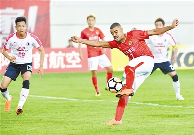 广州恒大队球员阿兰(前右)在对阵大阪樱花的亚冠比赛中射门得分。新华社记者 刘大伟 摄
