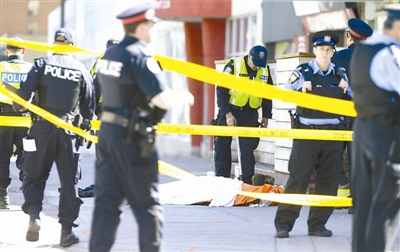 4月23日,在加拿大多伦多,警察在汽车撞人事件现场调查。加拿大多伦多警方23日说,当天下午该市发生的汽车撞行人事件已造成9人死亡、16人受伤。目前,肇事男子已被捕,多伦多警方正在全力调查此事,但尚不清楚肇事动机。 新华社发 (邹峥 摄)