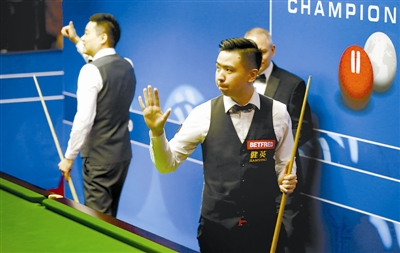 4月24日,肖国栋(右)在赛后向观众致意。当日,在英国谢菲尔德克鲁斯堡剧院进行的2018年世界斯诺克锦标赛首轮比赛中,中国选手丁俊晖以10比3战胜同胞肖国栋,晋级下一轮。 新华社发 (克雷格·布拉夫 摄)