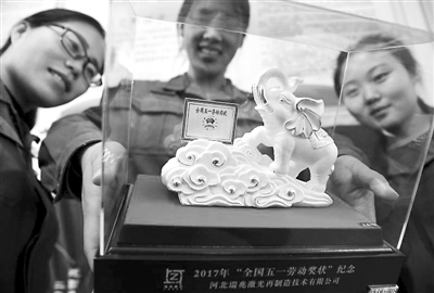 4月23日,河北瑞兆激光再制造技术公司员工手捧全国五一劳动奖状纪念品爱不释手。