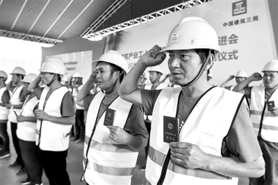 4月26日,在福建厦门集美区中建三局国贸天悦项目工地,工友在入会仪式上宣誓。
