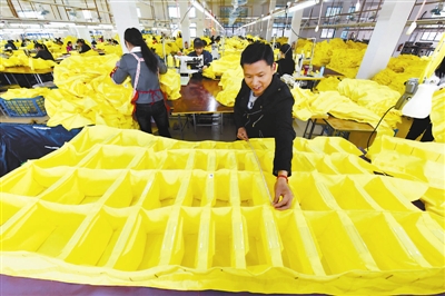 4月25日,白水乡文义村建档立卡贫困户张先和(前)在万翔运动用品制造公司扶贫车间就业。