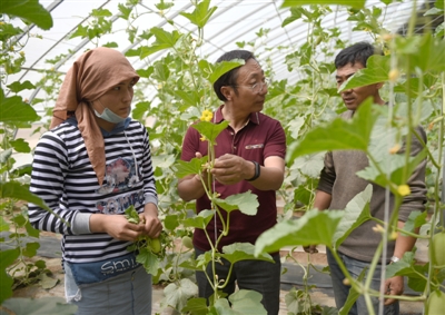 张锐在新疆和田国家农业科技园先导区内向当地群众传授技术。