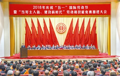 4月28日,2018年庆祝“五一”国际劳动节暨“当好主人翁、建功新时代”劳动和技能竞赛推进大会在北京人民大会堂举行。