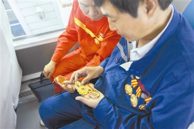 4月25日,同为“最美职工”的郭玉全(图右)和谭文波一起观摩他们获得过的各式奖章。