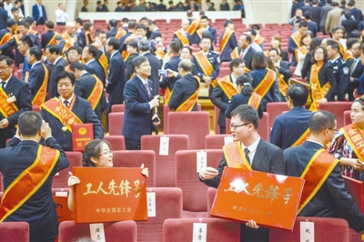 4月28日,大会结束后,受表彰的两名代表手捧“工人先锋号”牌匾起身交流。