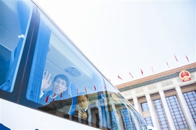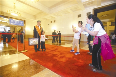 4月28日,几位从浙江来北京人民大会堂参观的游客邂逅刚刚参加完大会的代表,轮番上前合影。