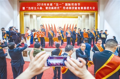 4月28日,2018年庆祝“五一”国际劳动节暨“当好主人翁、建功新时代”劳动和技能竞赛推进大会在京胜利举行。大会结束后,代表们纷纷起身走到台前合影留念。