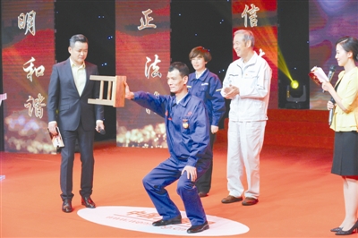 4月25日,在2018年全国“最美职工”发布仪式上,高级焊工冯世毅向观众展示自己平时练功的情景。为了能够抓稳焊钳,他平日都用小板凳来训练自己的手臂。
