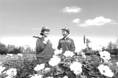 图为4月11日,该厂井楼采油管理区员工张园园(右)、张杏彩在“花园”中留影,定格这个春天。