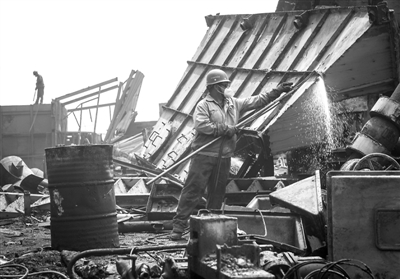 “五一”小长假期间,在湖北香溪化工有限公司宜都分公司拆除现场,工人们,加紧拆除作业。2017年以来,宜昌市把修复长江生态放在重要位置,出台了推进化工产业转型升级三年行动规划,决定在2019年底以前,将长江岸线一公里范围内的130多家化工生产装置依法全部“关、停、并、转、搬”,确保一江清水向东流。 新华社记者 肖艺九 摄