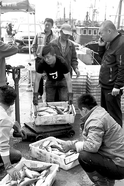 在青岛沙子口中心渔港,渔民在交易休渔前的最后一船鲅鱼(4月30日摄)。