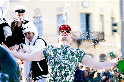 4月30日,在芬兰首都赫尔辛基市中心,几名年轻人在戴帽节上狂欢。