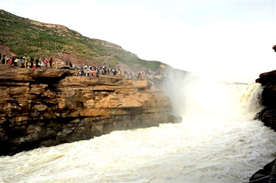 5月1日,游客在山西省临汾市吉县参观壶口瀑布。