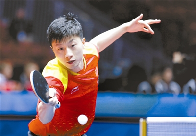 5月2日,马龙在比赛中回球。他以3比0战胜朝鲜队选手崔日。