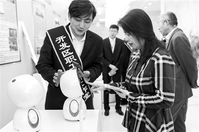 4月28日,光彩集团职工向参观者演示自主研发的养老服务机器人。