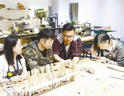 西安“木有话说”工坊的创始人李龙(右二)在指导初学者进行木制品打磨(4月13日摄)。