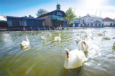 当地时间5月1日,英国剑桥仲夏公园,天气转暖,天鹅在水面畅游CFP供图