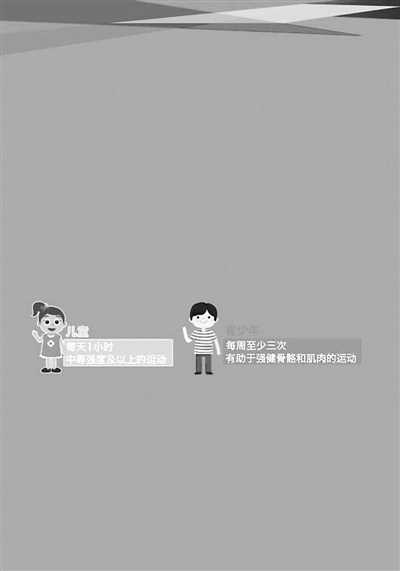 推荐儿童和青少年每天累计至少1小时中等强度及以上的运动,培养终身运动的习惯,提高身体素质,掌握运动技能,鼓励大强度的运动;青少年应当每周参加至少三次有助于强健骨骼和肌肉的运动。