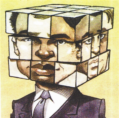 “看似幻术,亦是魔方;百变面孔,苦累终生”这幅画如哲人的警句,简单明了地勾勒出世间众生相,透析出社会中某些风气之弊。