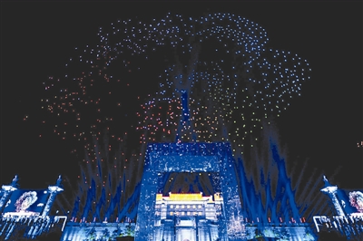 日前,“红五月·西安城墙国际文化节”拉开帷幕,图为开幕式上1374架无人机在永宁门上空编队进行表演。