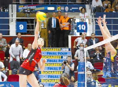 5月5日,瓦基弗银行队球员朱婷在比赛中进攻。当日,在罗马尼亚布加勒斯特举行的2018赛季欧洲女子排球冠军联赛半决赛中,土耳其瓦基弗银行队以3比2战胜意大利科内利亚诺队,晋级决赛。 新华社发(彼得雷斯库摄)