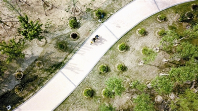 5月7日,游客在河北永清县韩村镇骑车(无人机拍摄)。