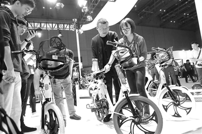 5月6日,参观者正在展台上体验不同的共享自行车与电动车。
