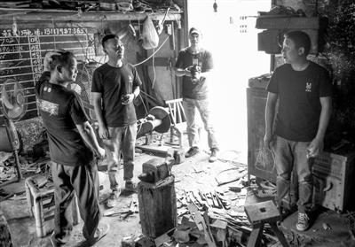 姚飞(左二)高岩(左三)在拍摄景德镇打利坯刀的老铁匠(2015年9月21日摄)。