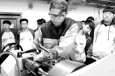 5月8日,初中生近距离体验“车床”工种技能。当日,在青岛西海岸新区,200余名初三学生代表走进青岛军民融合学院,参加初中生职校体验活动。在职校师生的指导下,他们初步了解了职校的专业设置和发展趋势,参观了学校先进的实训室,亲手实践操作了部分设备,近距离感受到职业的魅力。
