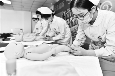 5月9日,安徽省合肥市蜀山区井岗镇井岗园区联合民众医院举办“5·12护士节暨新入职护士技能竞赛”,技能竞赛包括新生儿护理、心肺复苏术、皮内注射法及简易呼吸器的使用等,50余名新护士展开为期二天的技能“大比拼”。葛宜年 摄/ 视觉中国
