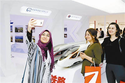 5月8日,在土耳其安卡拉,观众在国际高铁大会上与中国“复兴号”高铁列车模型合影。