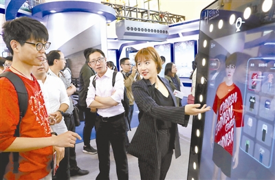5月10日,工作人员(右一)指导参观者使用一款互联网智能试衣镜。