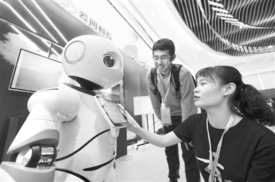 5月11日,在主题展“未来之城”上,工作人员和机器人互动。